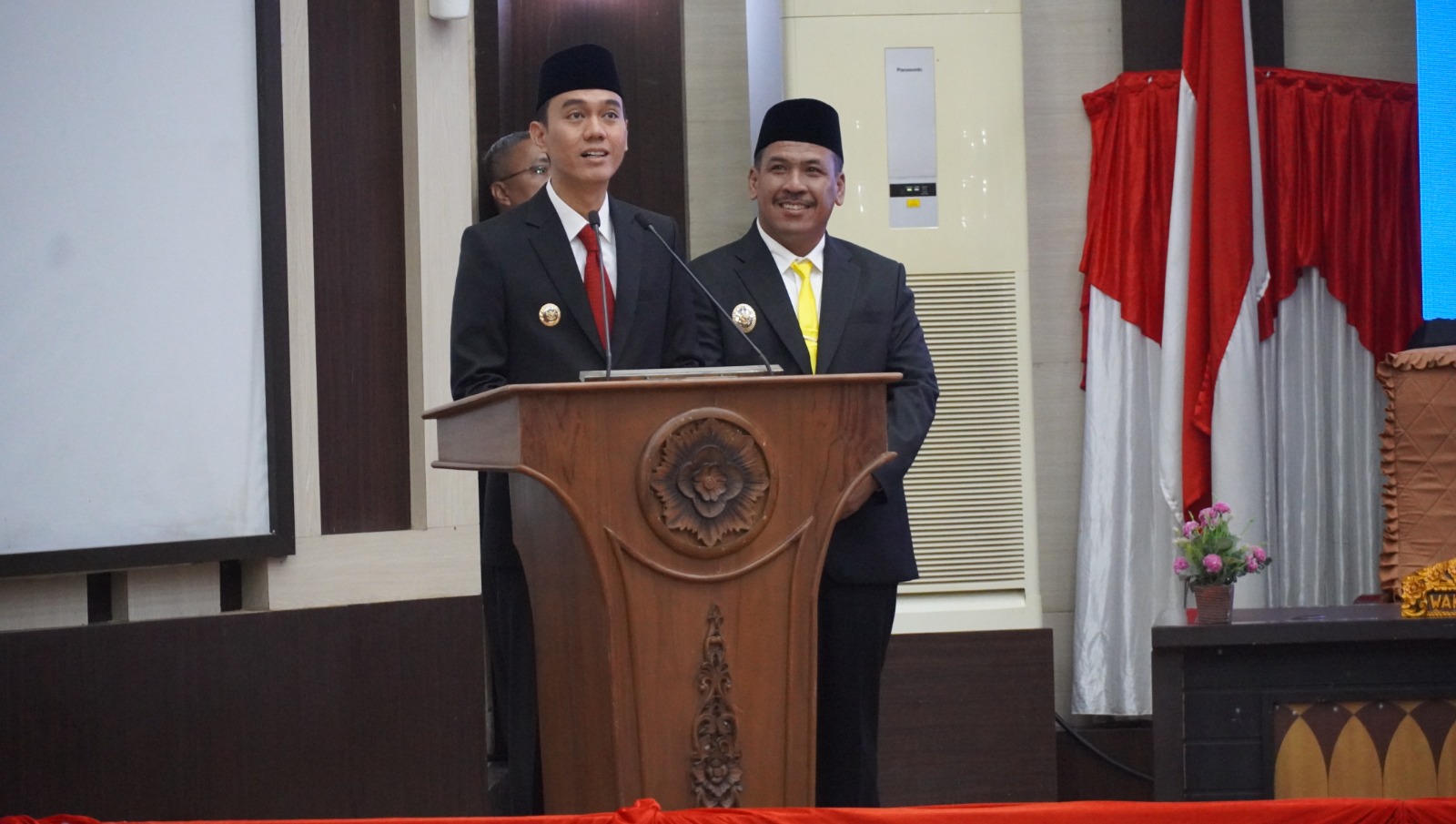 Kabupaten OKI-Bupati Ogan Komering Ilir, Muchendi Mahzareki menyampaikan Pidato Perdana dalam rapat paripurna DPRD, Selasa (4/3/2025) di Ruang rapat DPRD.